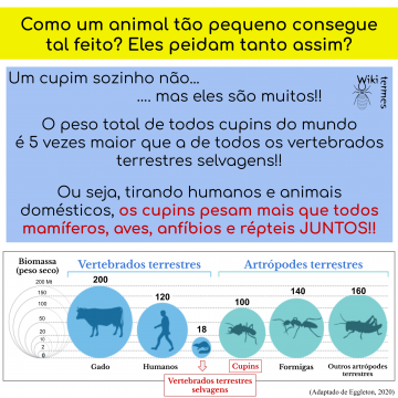 Mas como um um animal tão pequeno consegue produzir tanto gás metano? Eles peidam muito? Bom, na verdade um único cupim é capaz de produzir apenas meio micrograma de metano por dia, um valor bastante irrisório. A grande questão aqui não é a quantidade por indivíduos, mas sim a quantidade de indivíduos! Um único cupim pesa, em média, 0,96 mg; mas a biomassa dos cupins como um todo, isto é, o peso de todos os cupins do mundo, é estimado em 100 milhões de toneladas (considerado apenas o peso seco deles). Para se ter uma comparação, a biomassa de todos os vertebrados terrestres selvagens (ou seja, excluindo humanos e animais domésticos) é estimada em 18 milhões de toneladas. É isso mesmo! A biomassa dos cupins é 5 vezes maior do que a de todos os grandes mamíferos, aves, crocodilos, lagartos, cobras… JUNTOS! !