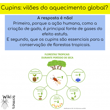 Então, seria os cupins os grandes vilões do aquecimento global? A resposta é não. Primeiro porque existem evidências de que metade do metano produzido pelos cupins, pelos menos para aqueles que constroem montículos, é oxidado por bactérias metanotróficas (bactérias que utilizam metano como fonte de energia), presentes nos próprios ninhos dos cupins. E segundo que a ação humana, como geração de energia e criação de gado, é a principal fonte de gases do efeito estufa recente. Além disso, os cupins são essenciais na conservação de florestas tropicais e na manutenção do equilíbrio dos ecossistemas naturais (veja o texto os guardiões das florestas).